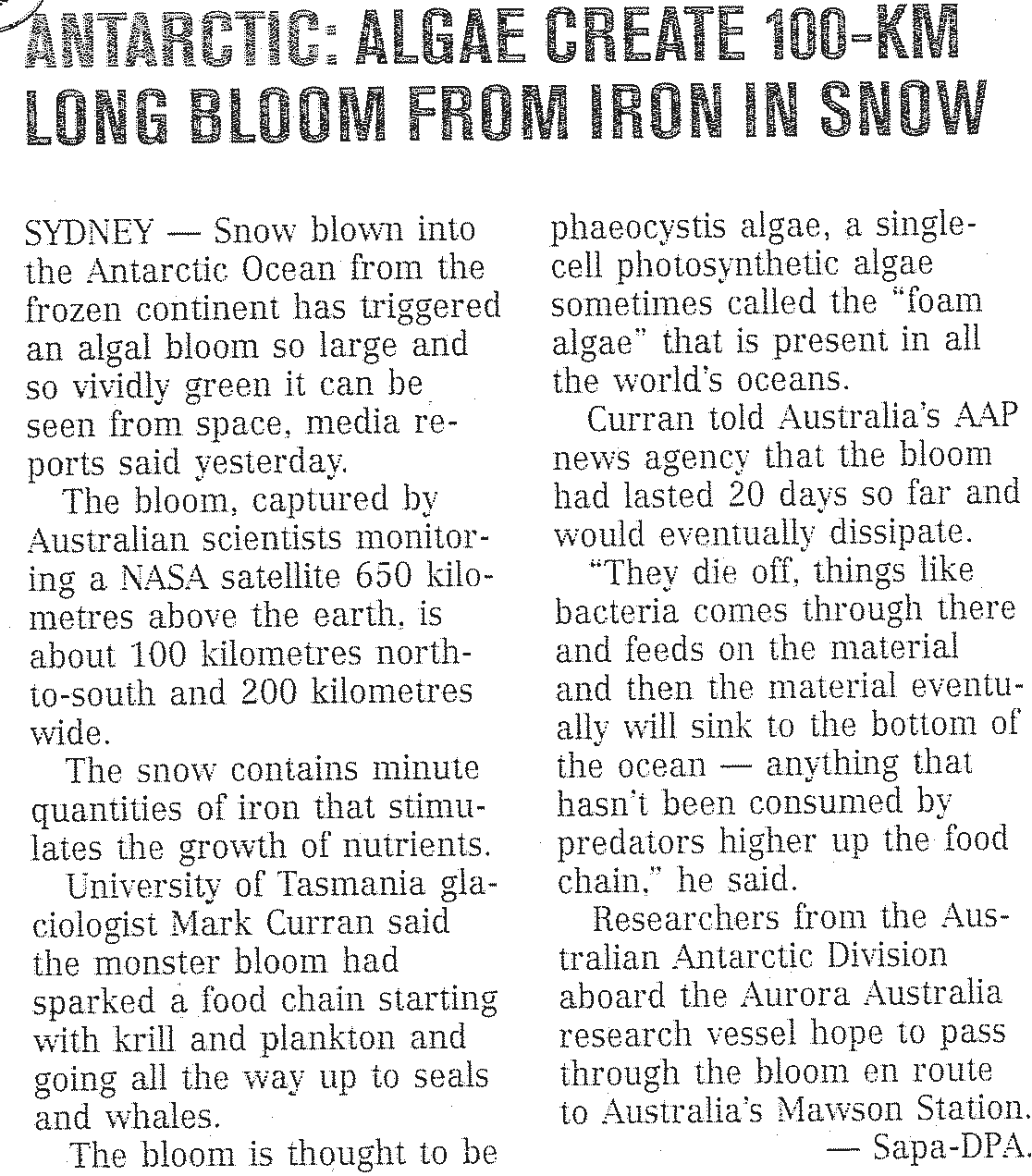 With reference to above article, name the abiotic factor that is responsible for the bloom and how the factor reached the Antarctic Ocean.