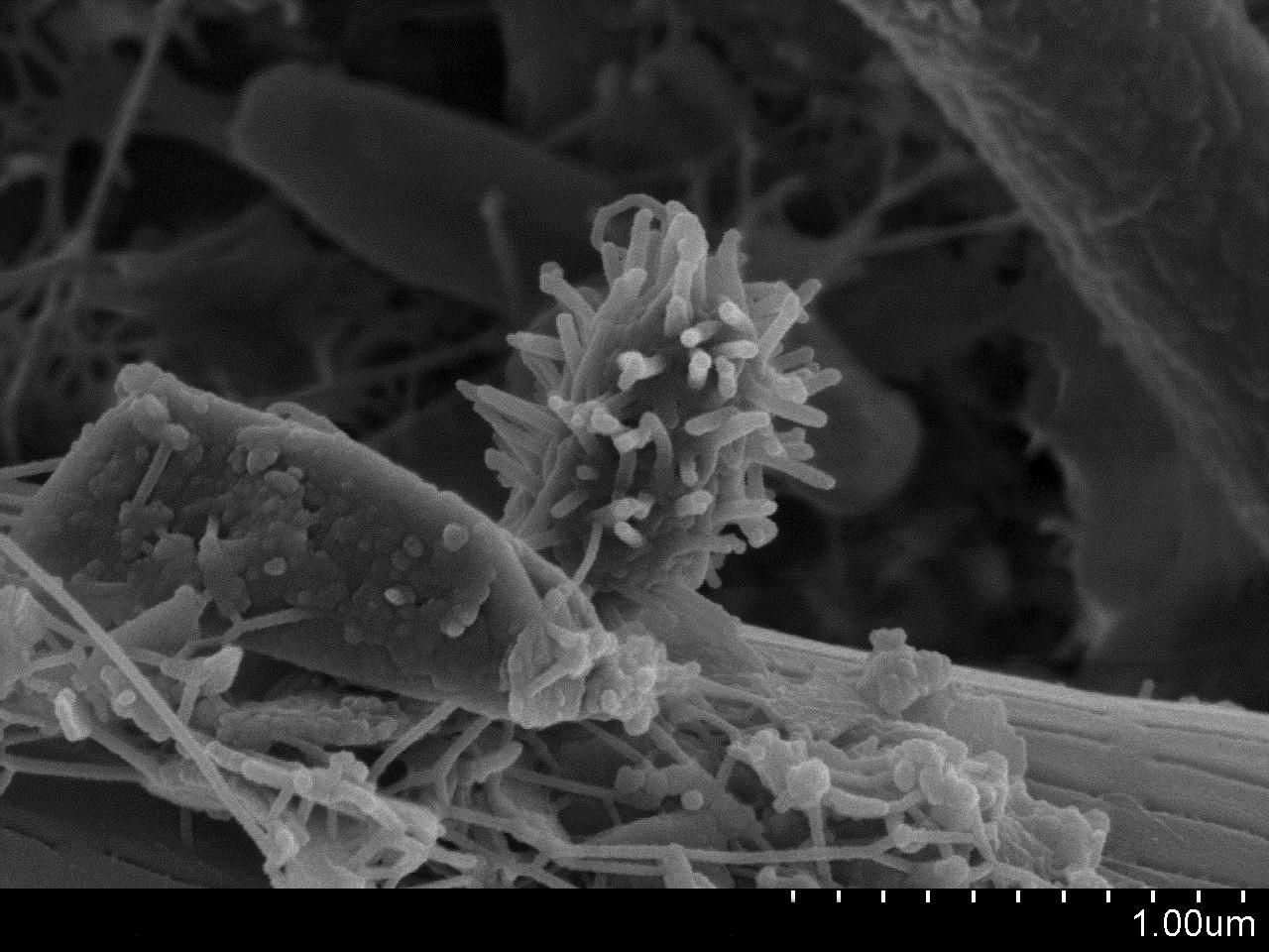 SEM: A natural community of bacteria growing on a single grain of sand. |