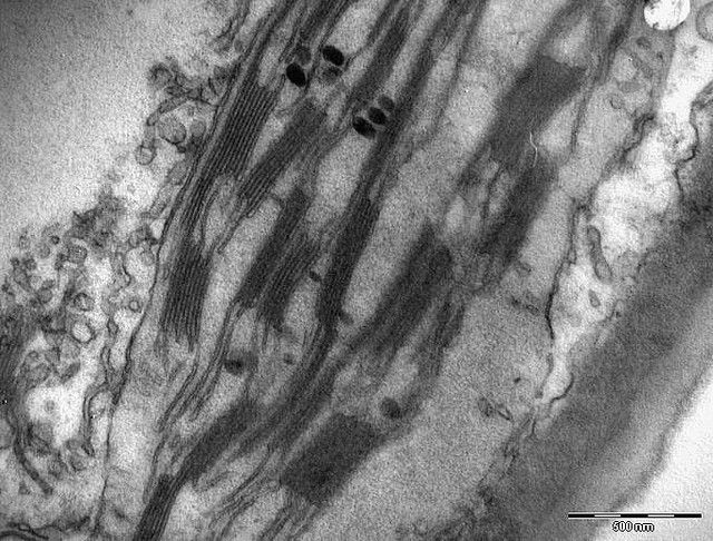 TEM: Image of chloroplast, showing thylakoid discs within a eukaryotic cell. |