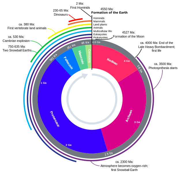 Figure 10.2: "Human history on Earth is a mere second on the clock". In this representation, the two million years' of human history constitute an effect too small to be visible on the timescale.