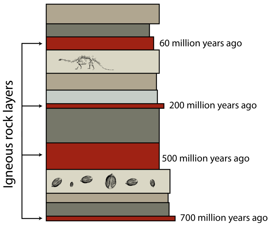 Figure 10.5: In relative dating, fossils are dated relative to layers of igneous (volcanic) rocks that they are near. Older layers are deeper in the Earth, younger layers are closer to the surface.
