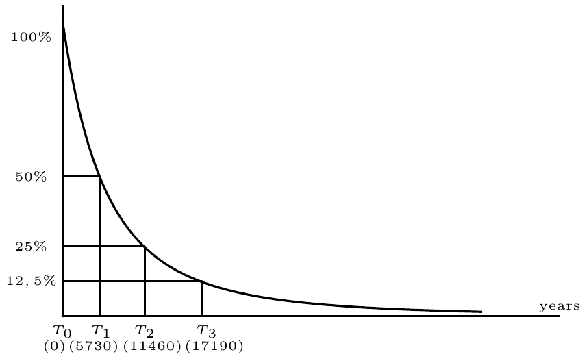 Radiometric dating: Graph showing the half-life of C-14. The amount of carbon-14 halves every 5730 years.