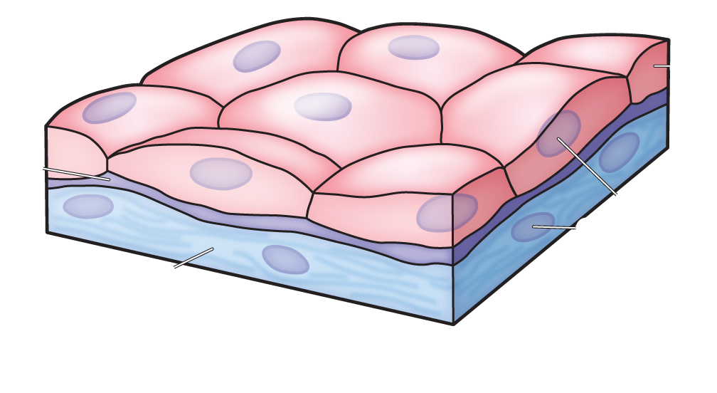 | Simple squamous and stratified squamous | Simple: capillaries, alveoli (in lungs); stratified: skin | Thin and flat cells that are elliptically shaped and lie on basement membrane. Simple squamous epithelium is one-cell thick. Stratified squamous epithelium consists of many layers. | Responsible for diffusion. Thin structure allows for movement of substances across the cells. |