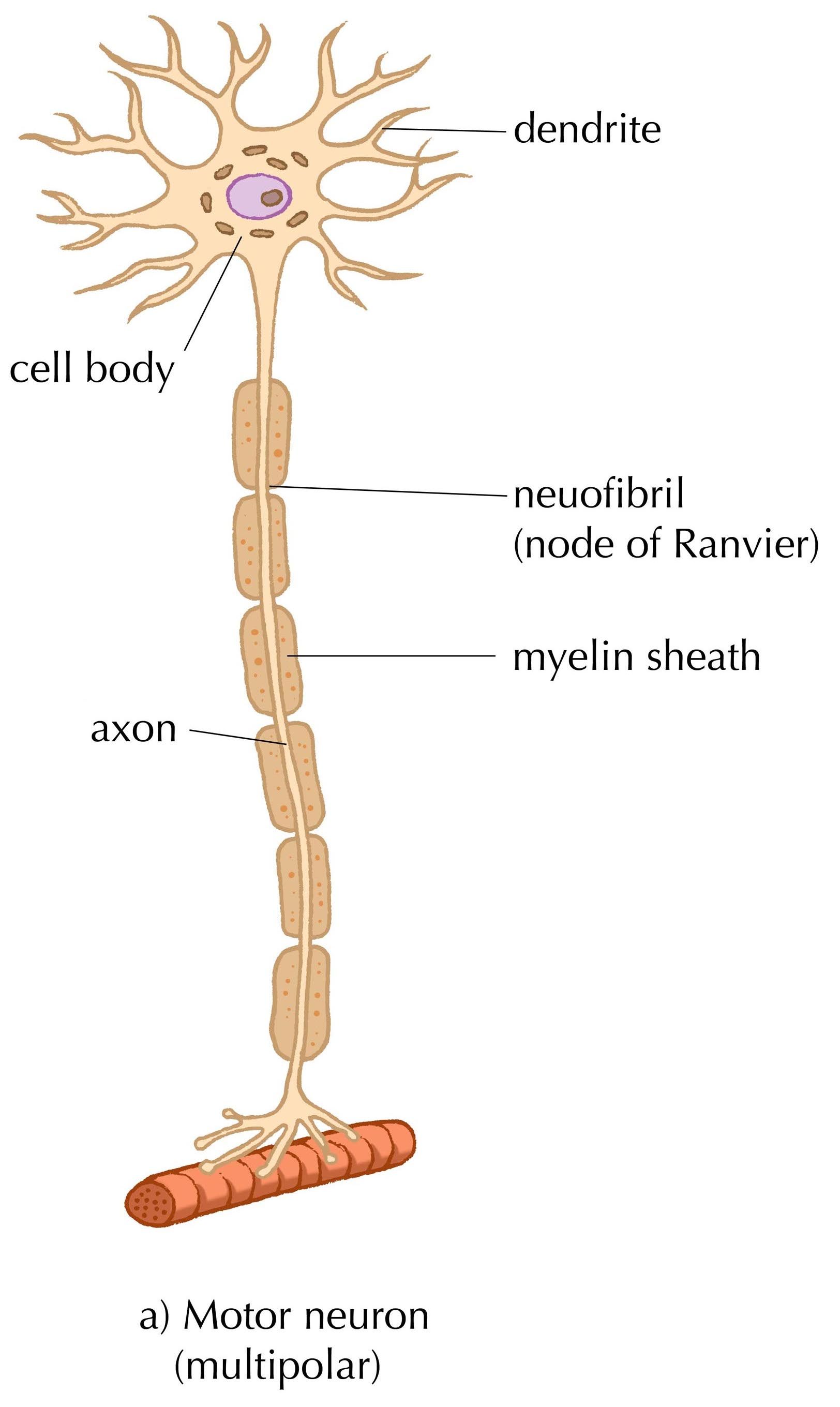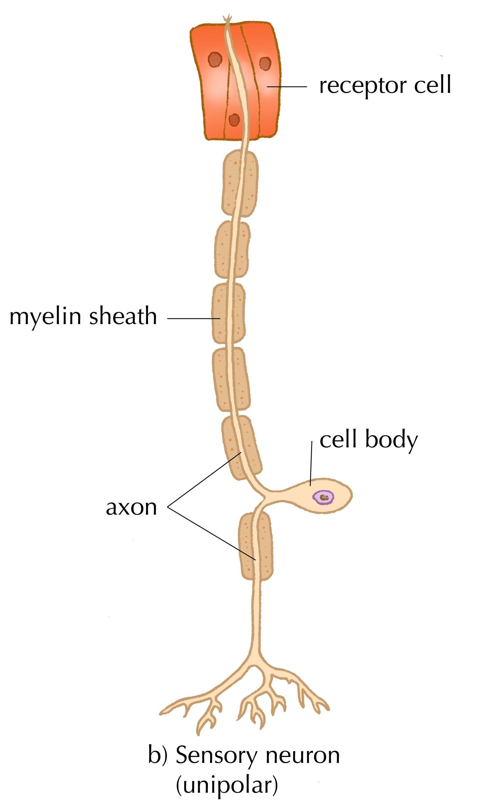 | Sensory neurons are responsible for sending information about the environment (called stimuli) to the central nervous system. They are activated by touch, light, temperature, pressure, hearing etc. Sensory nerve cells (or sensory neurons) carry impulses (electrical signals) from a receptor to the central nervous system (CNS). | These neurons are very short compared to the sensory and motor neurons. The connectors or interneurons connect a sensory neuron with a motor neuron. The impulse travels from the cell body at the head end along the short axon to the dendrites. | Motor neurons carry impulses from the CNS to muscles or glands. In most cases the motor neuron causes muscle contraction (movement), but motor neurons can also cause secretion of substances by glands. The motor neuron causes a response via chemicals known as neurotransmitters. |