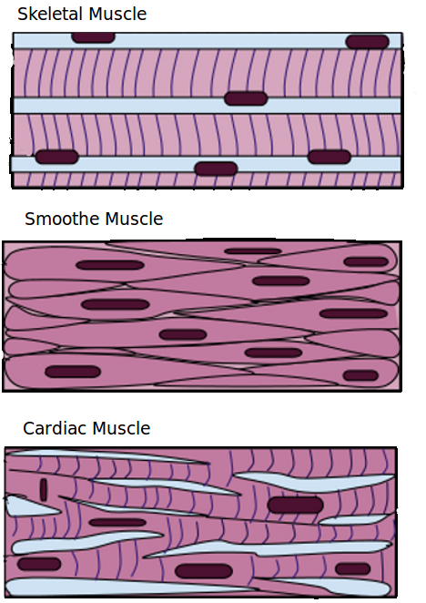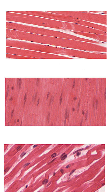 Skeletal and cardiac muscle are striated. Striated muscle cells are striped, with regular patterns of proteins responsible for contraction. Striated muscle contracts and relaxes in short bursts, whereas smooth muscle contracts for longer.