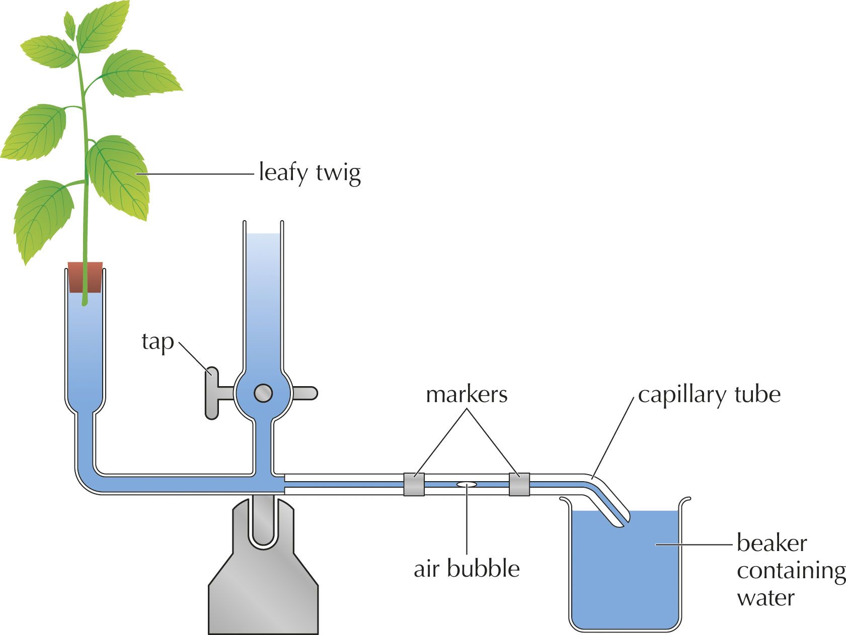 To measure the rate of transpiration we use a piece of equipment called a potometer. A potometer measures how factors such as light, temperature, humidity, light intensity and wind will affect the rate of transpiration. The main type of potometer is the 'bubble' potometer shown in Figure 5.19. The potometer measures the amount of water lost from a leafy shoot by monitoring the rate at which an air bubble moves along the narrow tube as the leafy shoot sucks up water to replace the water lost by the transpiration of the plant.