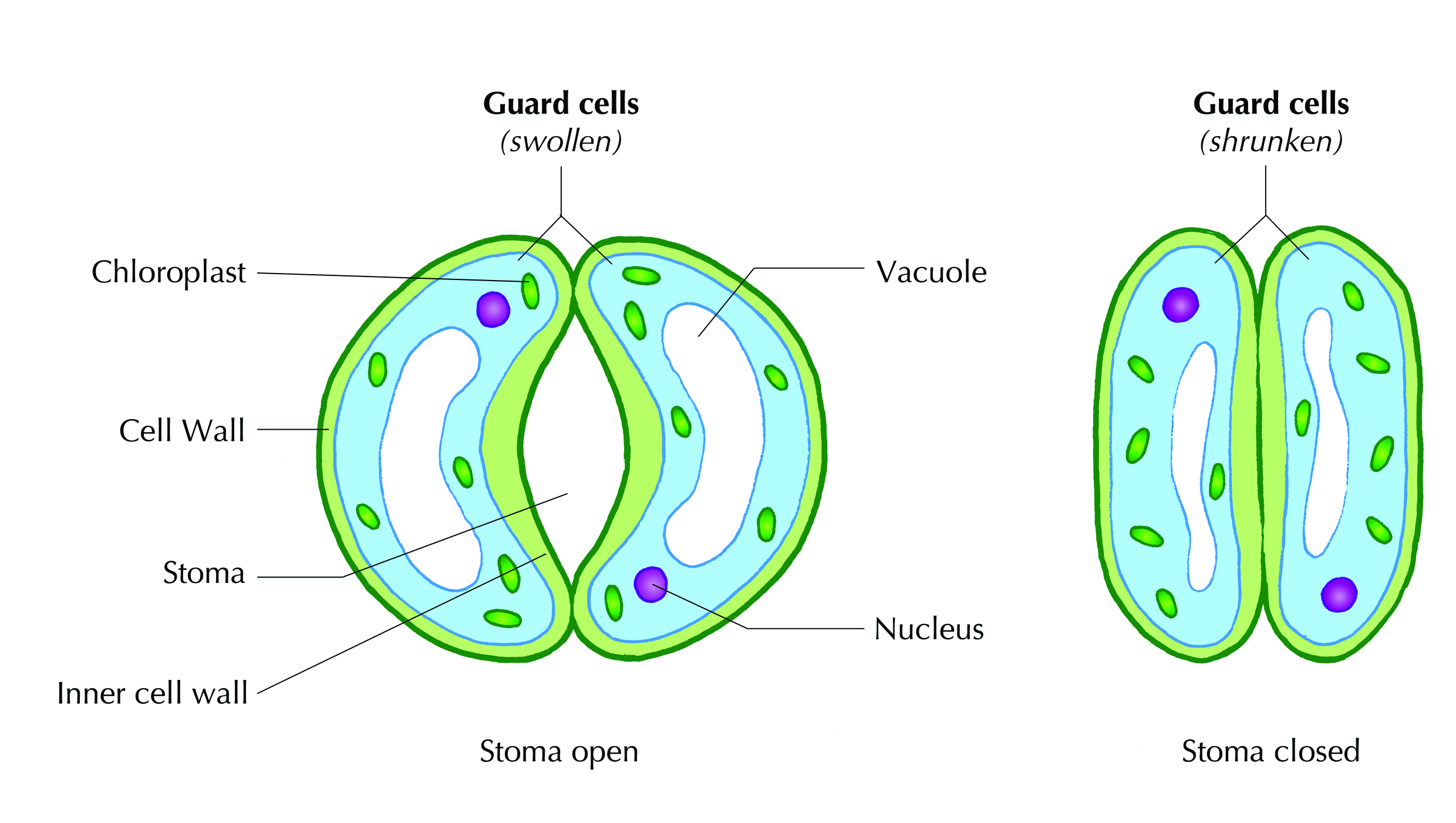 Figure 5.14: The opening and closing of stomata. Different environmental conditions trigger both the opening and closing of stomata.