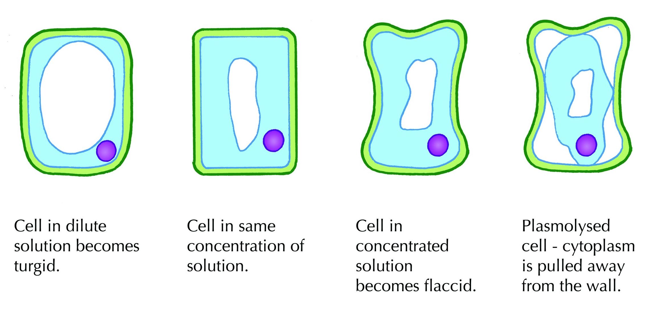 Plants need water to maintain turgor pressure. Turgor pressure is what provides the plant with much of its structural support. Have a look at Figure 5.24 which shows the effect of osmosis on the turgidity of cells.