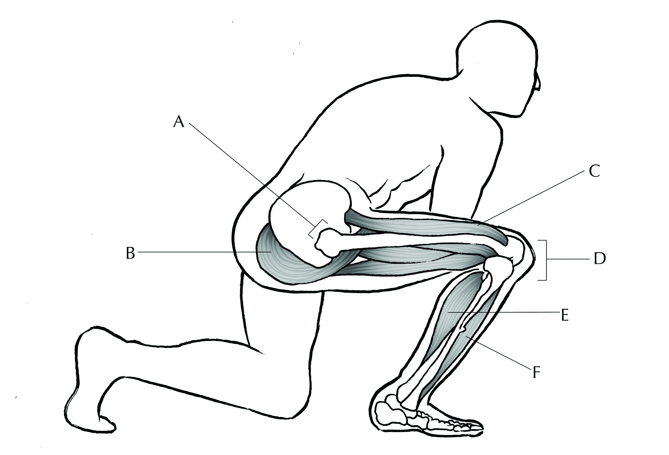 The diagram below shows the legs of an athlete while he is waiting for a race to start. The letters A to F show some of the muscles as well as joints that will be used during the race.