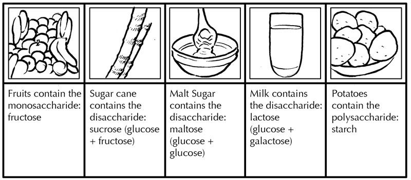 Figure 1.7: Examples of food sources of various monosaccharides, disaccharides and polysaccharides.