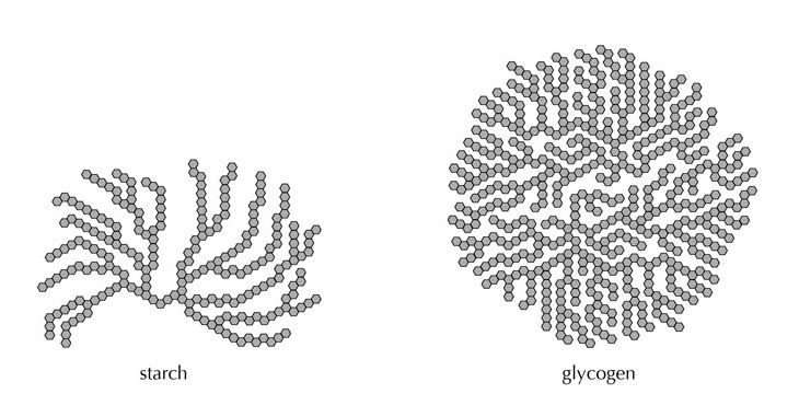 Figure 1.8: A comparison between starch and glycogen. Glycogen is more extensively branched than starch.