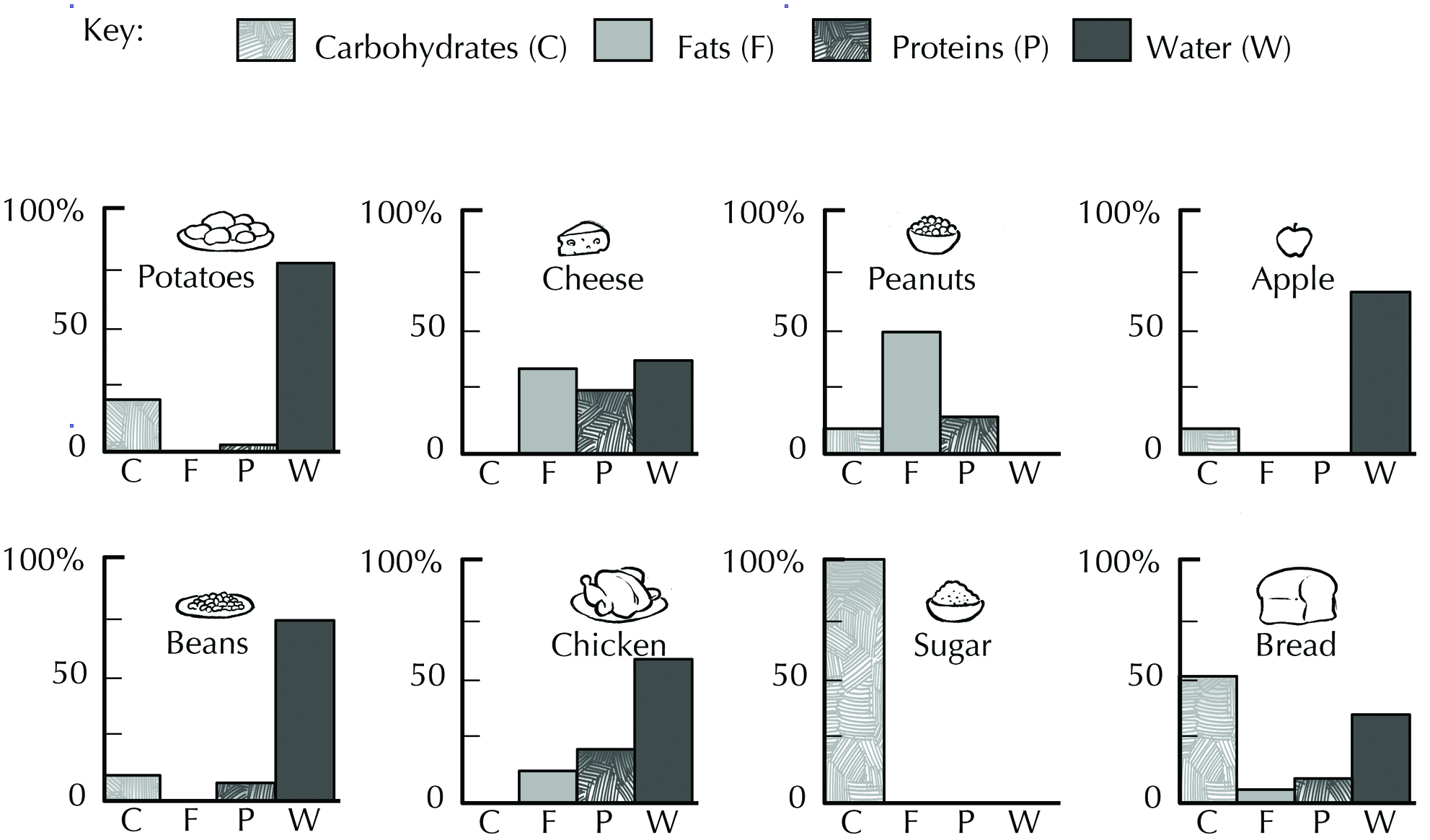 The histograms below show the percentage of carbohydrates, fats, proteins and water in eight types of foods.