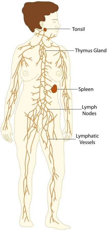 Most of the disease-fighting function of the adult mammal is carried out by the lymph nodes which occur along the lymph ducts. Lymph nodes are small, irregularly-shaped masses through which lymph vessels flow. Clusters of nodes occur in the armpits, groin, and neck. Cells of the immune system line channels through the nodes and attack bacteria and viruses travelling in the lymph, so they basically act as tiny filters.