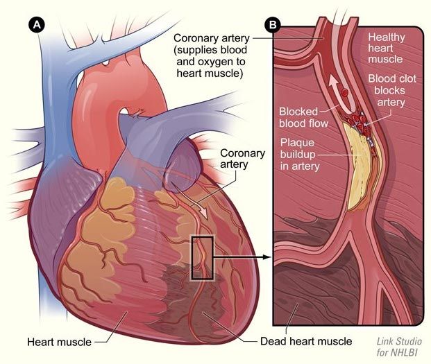 This is also referred to as a myocardial infarction. Heart muscles are provided with oxygenated blood by a system of coronary arteries. Blocked flow of blood can cause the death of cardiac muscle due to lack of oxygen. Arteries get blocked as a result of the gradual build-up of lipids and cholesterol, which form a plaque. This condition of plaque build up in the arteries is referred to as atherosclerosis. When a plaque bursts, it causes blood to clot at the site of the rupture and obstructs the artery (see diagram in figure:damagedarteryblocked). Often there are no symptoms of atherosclerosis. However, some people who have narrowed coronary arteries experience chest pain, (angina), when blood flow to the heart is insufficient.