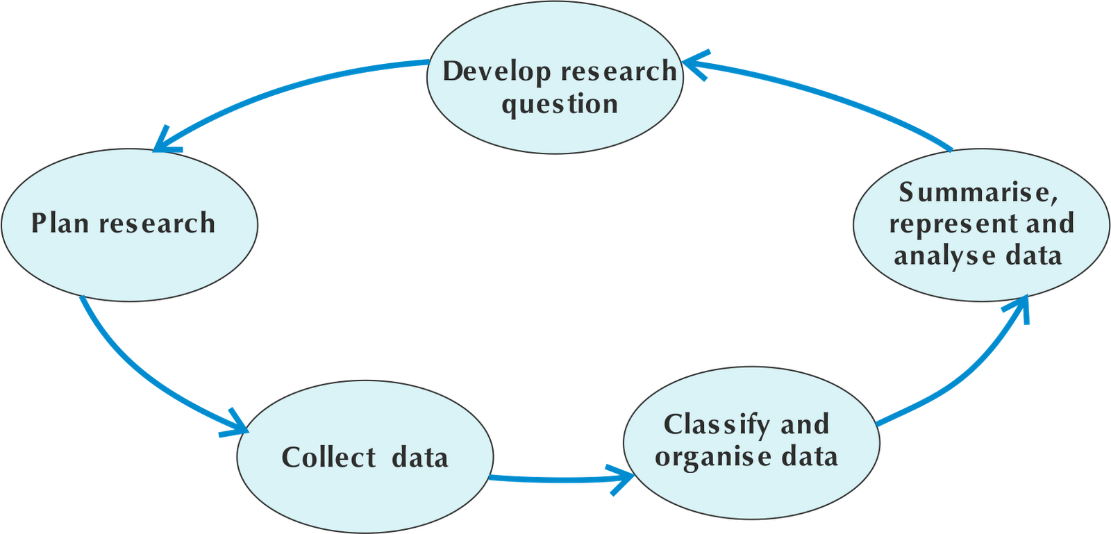We represent the process of data handling as a cycle, because once we have analysed the results we may have new questions