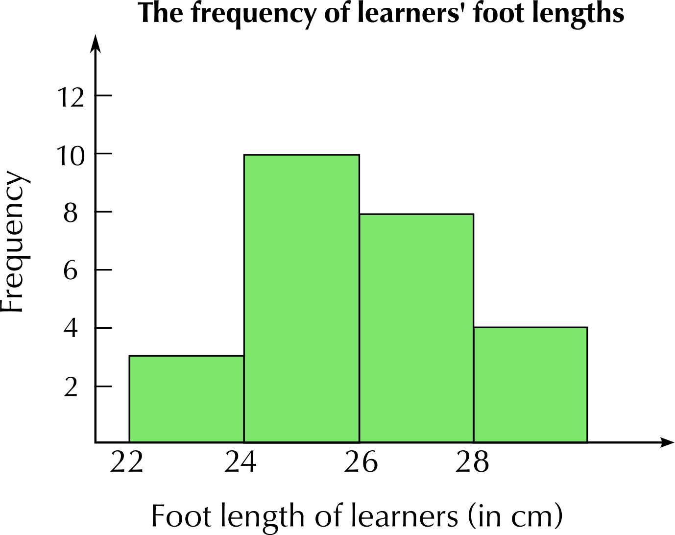 Histograms are different from bar graphs in that they usually represent continuous data. Data that is displayed on a histogram is also grouped. Consider the following table of the foot lengths of learners in a class, and the frequency of those lengths.