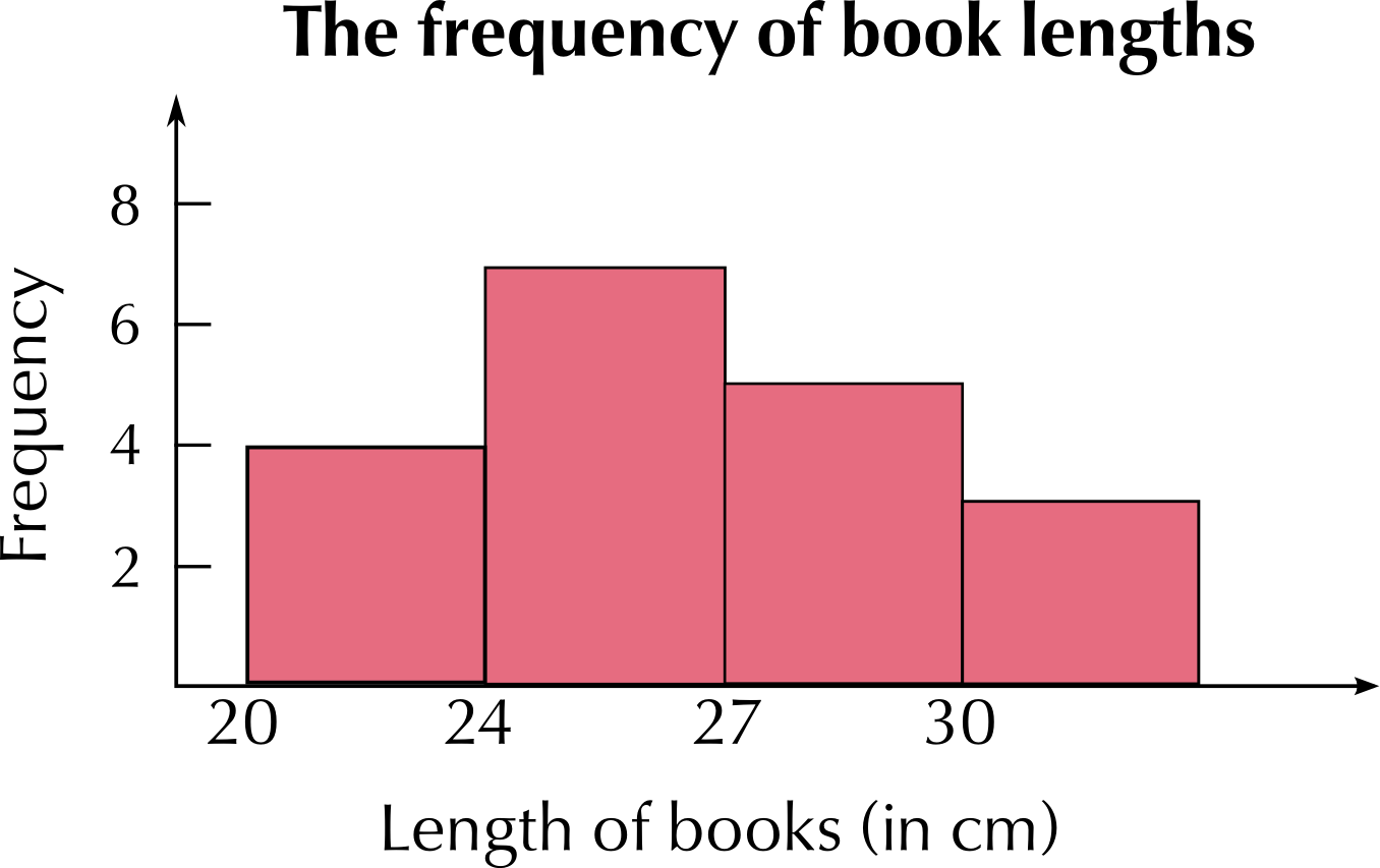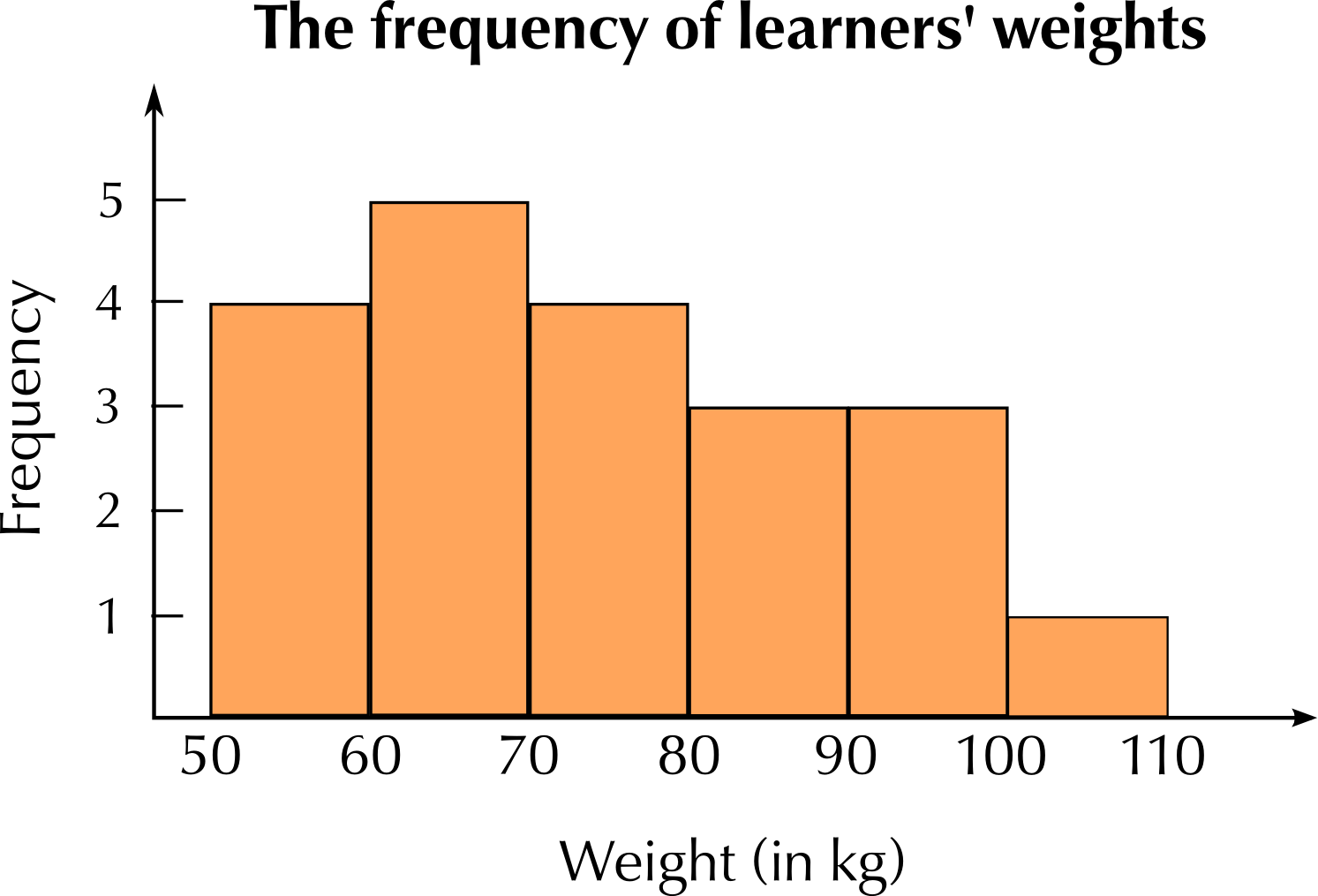 Notice that unlike in the bar graph in the previous section, in the histogram, the bars are drawn next to each other - there are no spaces between them. This is to indicate that the data is continuous.