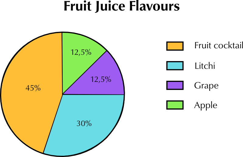 \(\text{45}\%\) of \(\text{120}\) learners = \(\text{54}\) learners who chose fruit cocktail. \(\text{30}\%\) of \(\text{120}\) = \(\text{36}\) learners who chose litchi. \(\text{12,5}\%\) of \(\text{120}\) learners = \(\text{15}\) learners who chose grape. \(\text{12,5}\%\) of \(\text{120}\) = \(\text{15}\) learners who chose apple juice.