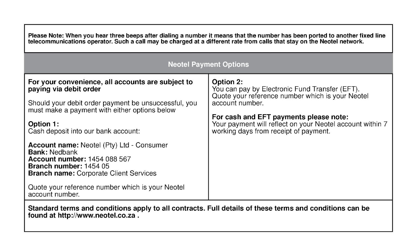 She can make a cash deposit at Nedbank or she can pay via Electronic Fund Transfer (EFT)