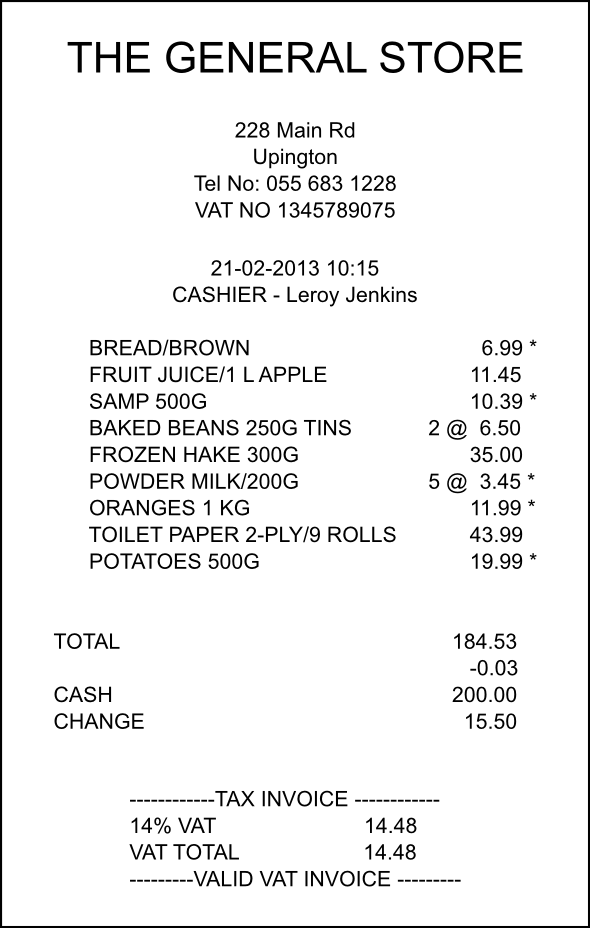 Alison paid with cash, and received \(\text{R}\,\text{15,50}\) change. This means she paid \(\text{R}\,\text{184,50}\) for her shopping. Explain why this amount is different to the Total of \(\text{R}\,\text{184,53}\).