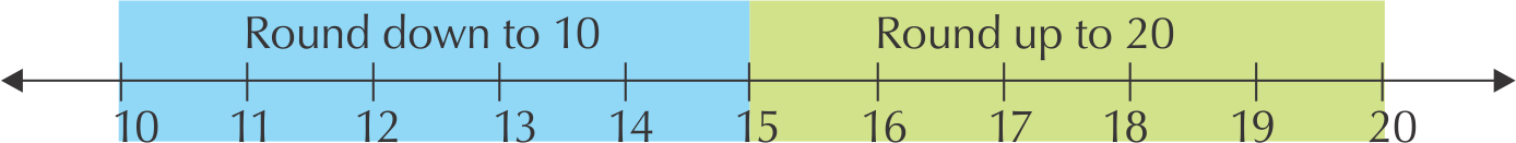 When we round off to the nearest \(\text{10}\), we follow the simple rule that numbers with units digits from \(\text{1}\) to \(\text{4}\) are rounded down to the lower ten, while numbers with units digits from \(\text{5}\) to \(\text{9}\) are rounded up to the higher ten.