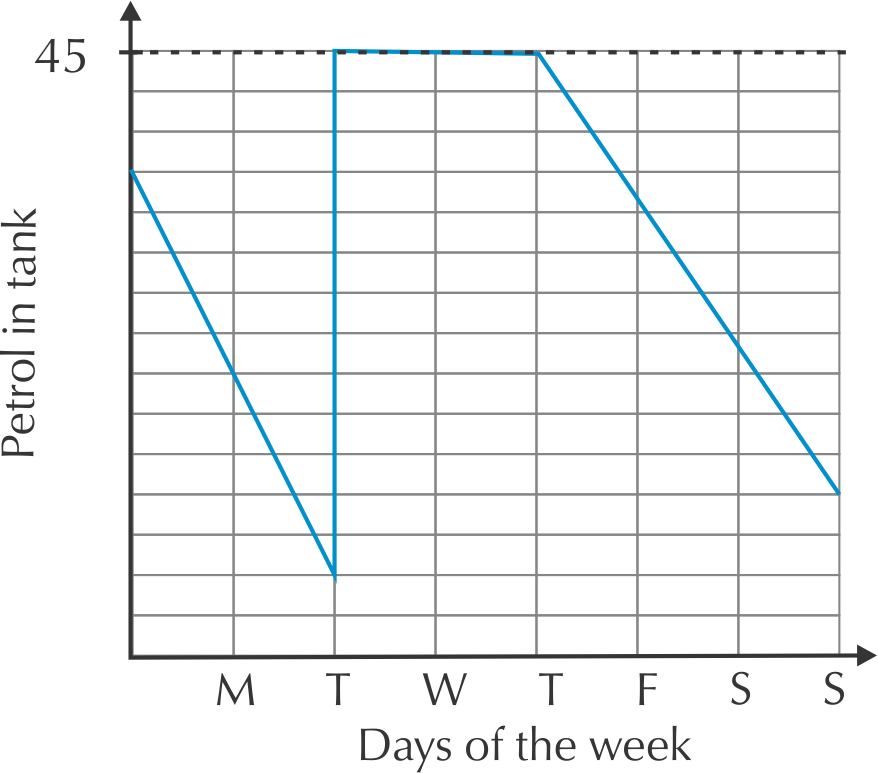 Pumeza's car takes \(\text{45}\) litres of petrol. The graph below shows the amount of petrol in the tank over one week.