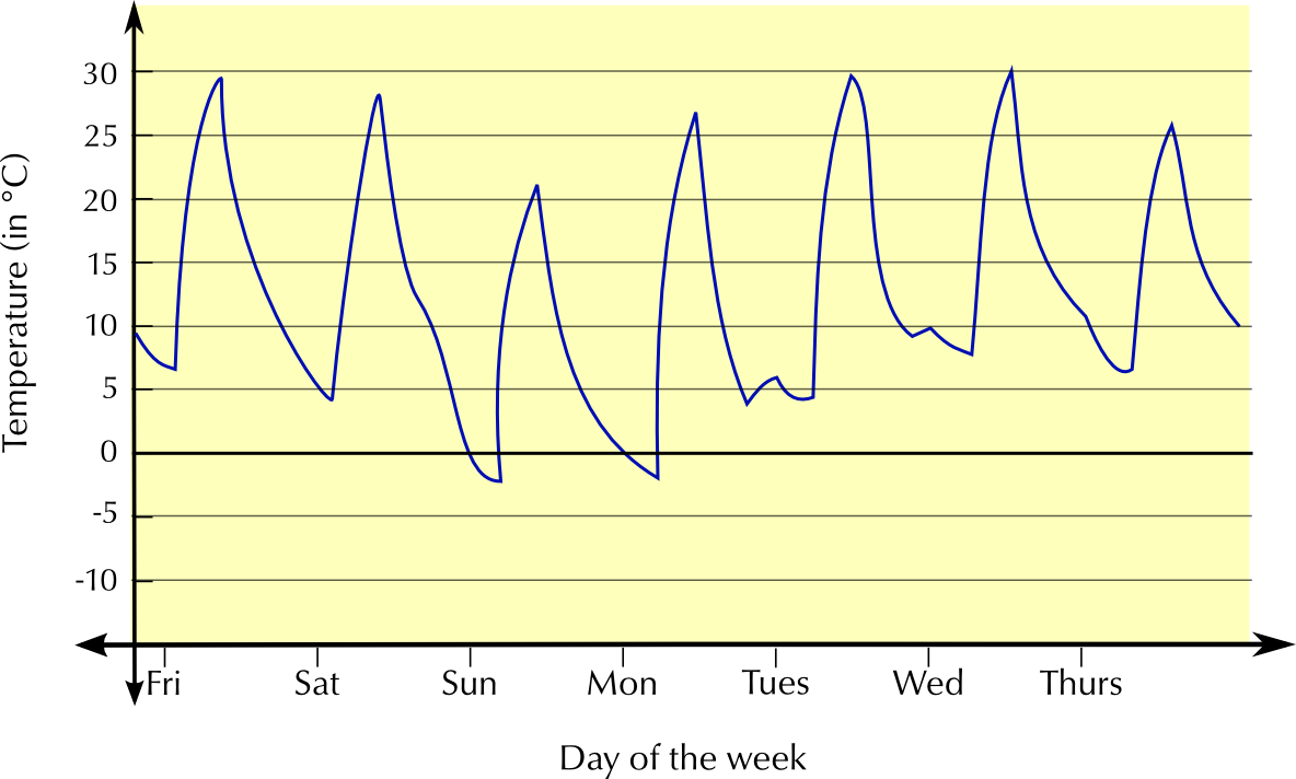 Minimum temperature is approximately \(\text{7}\)\(\text{°C}\) maximum is approximately \(\text{30}\)\(\text{°C}\). \(\text{30}\)\(\text{°C}\) - \(\text{7}\)\(\text{°C}\) = \(\text{23}\)\(\text{°C}\) difference.