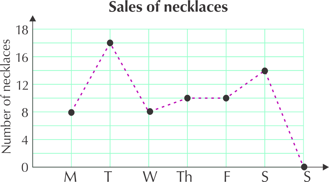 The highest point is on Tuesday (\(\text{17}\) necklaces sold).