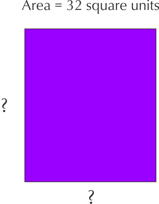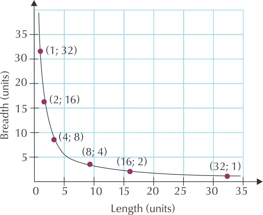 A rectangle has a fixed area of \(\text{32}\) square units, but the length \(l\) and breadth \(b\) can both change. If the length is smaller, the breadth gets bigger, because the area stays the same.
