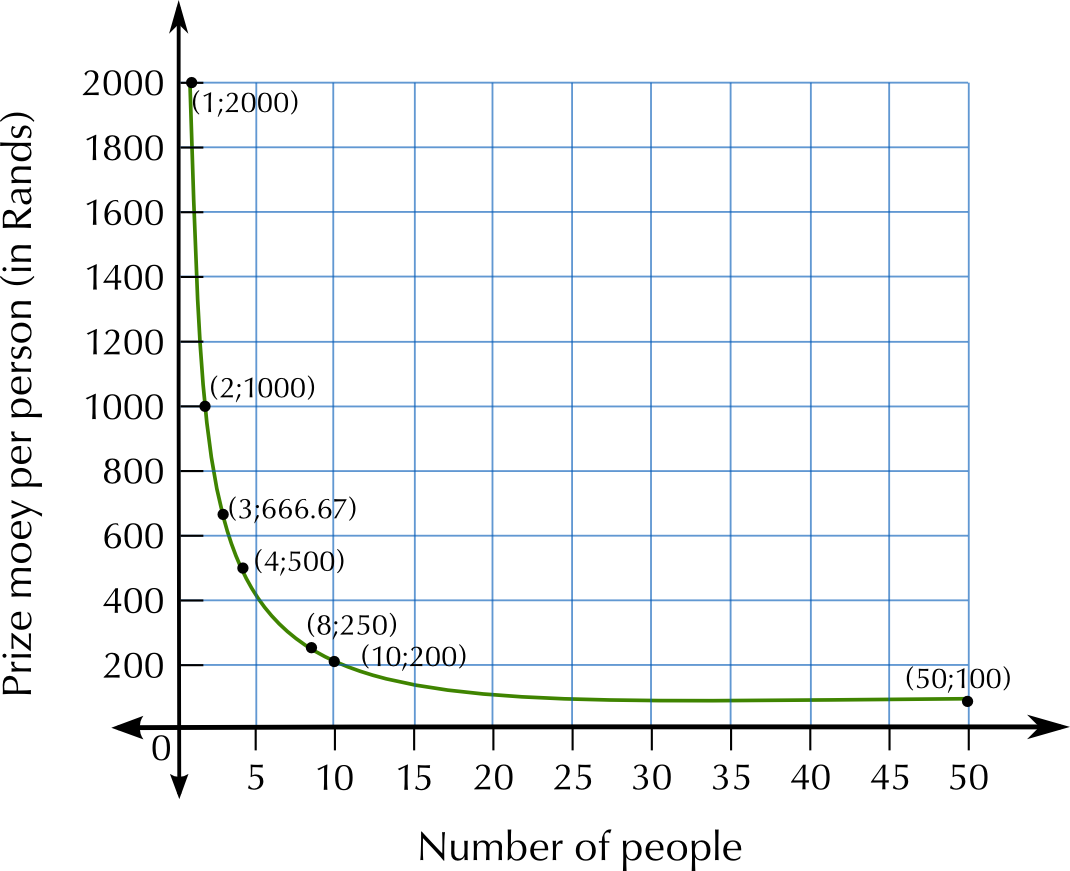 Lerato decides to get a group of friends together to play a lucky draw game. The bigger the group, the more tickets they can buy, but if they win, they will have to share the prize among more people. The total amount of money is \(\text{R}\,\text{2 000}\).