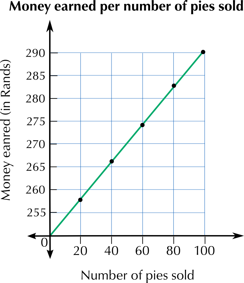 Because the graph is continuous, it will allow him to calculate how much money he earned for any number of pies. The precision with which he can read off the graph however, depends on the intervals between units on the graph's axes.