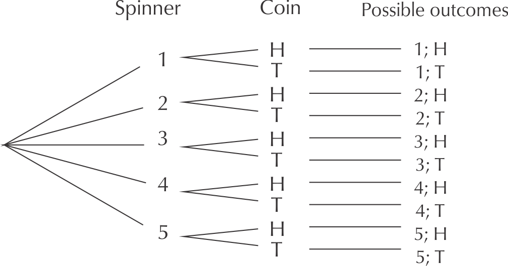 Draw a tree diagram with the first set of branches showing the possible outcomes for spinning the spinner in question \(\text{3}\). Then add the outcomes for a coin toss to each of the branches.