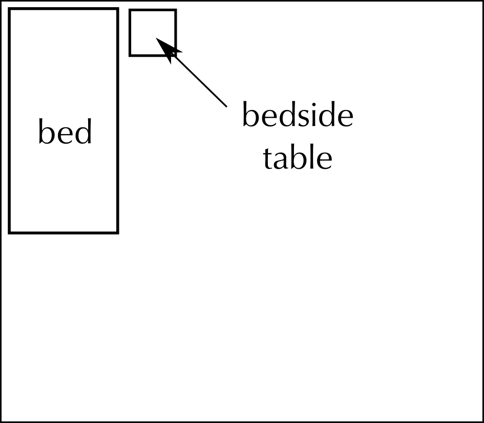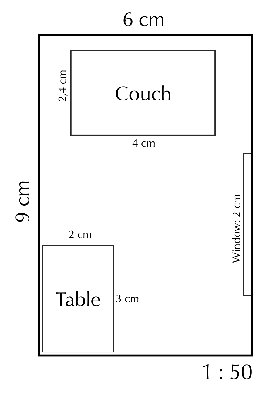The bedroom in the picture is \(\text{3,5}\) \(\text{m}\) by \(\text{4}\) \(\text{m}\). It has a standard sized single bed of \(\text{92}\) \(\text{cm}\) by \(\text{188}\) \(\text{cm}\). The bedside table is \(\text{400}\) \(\text{mm}\) square. Draw a floor plan to show the layout of the room. Use the number scale \(\text{1}\) : \(\text{50}\).