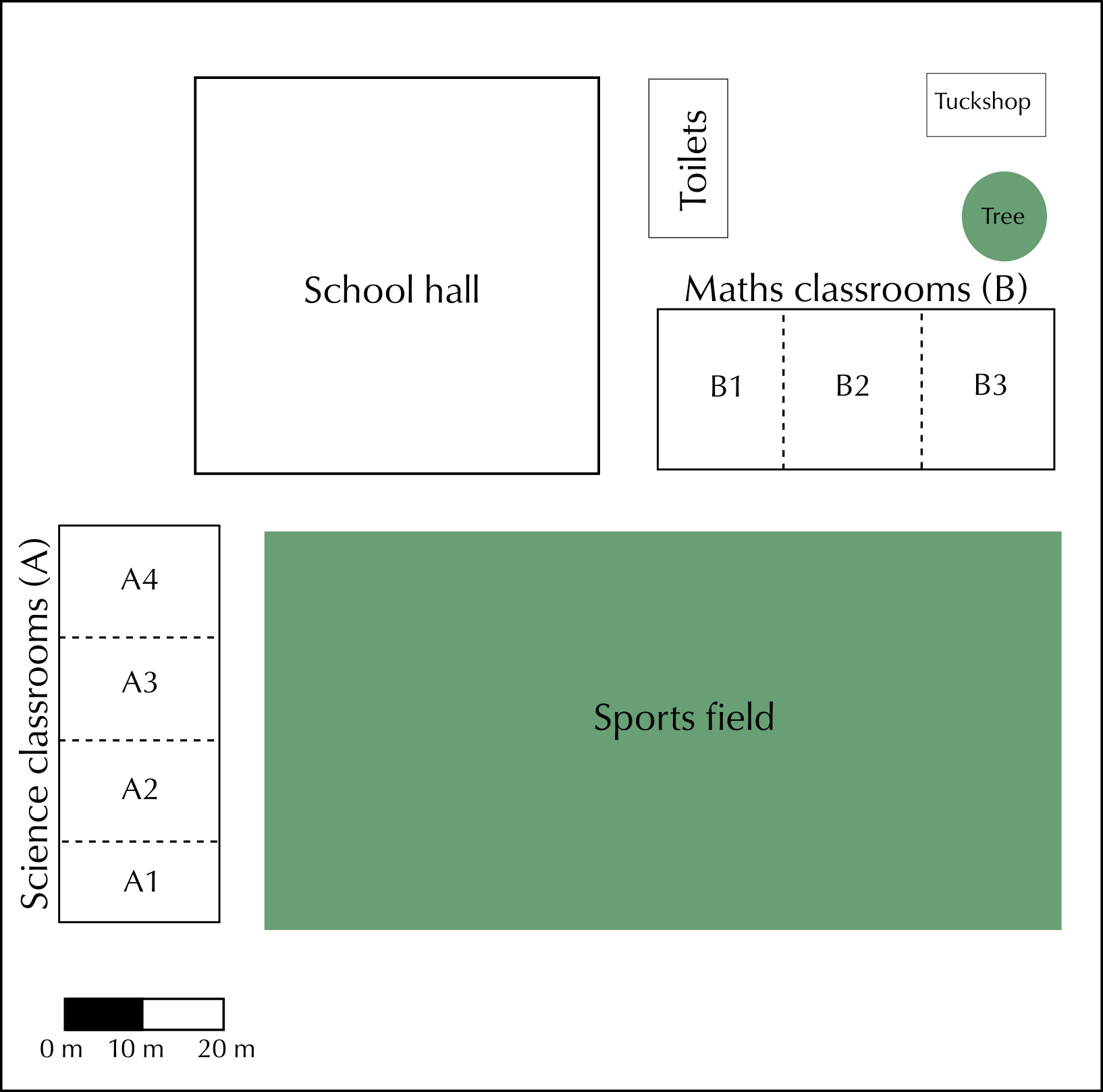 Tebogo, a new learner, has started at your school. You are in the Science classroom, A1, when the break bell rings. Explain to Tebogo how to get to the tuckshop.