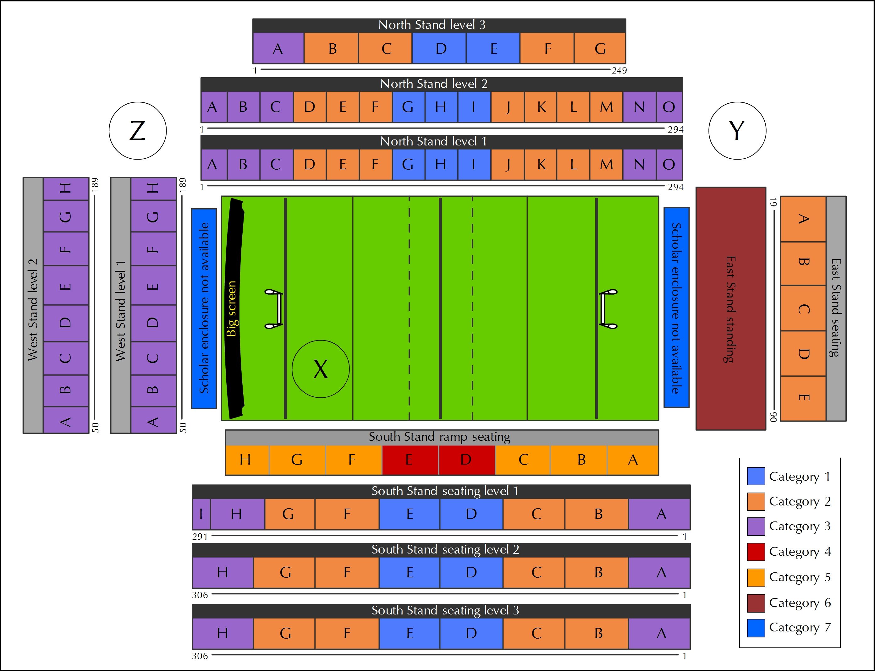 The West Stand has the most Category 3 seats. It is on the left of the stadium, between the North Stand and the South Stand.