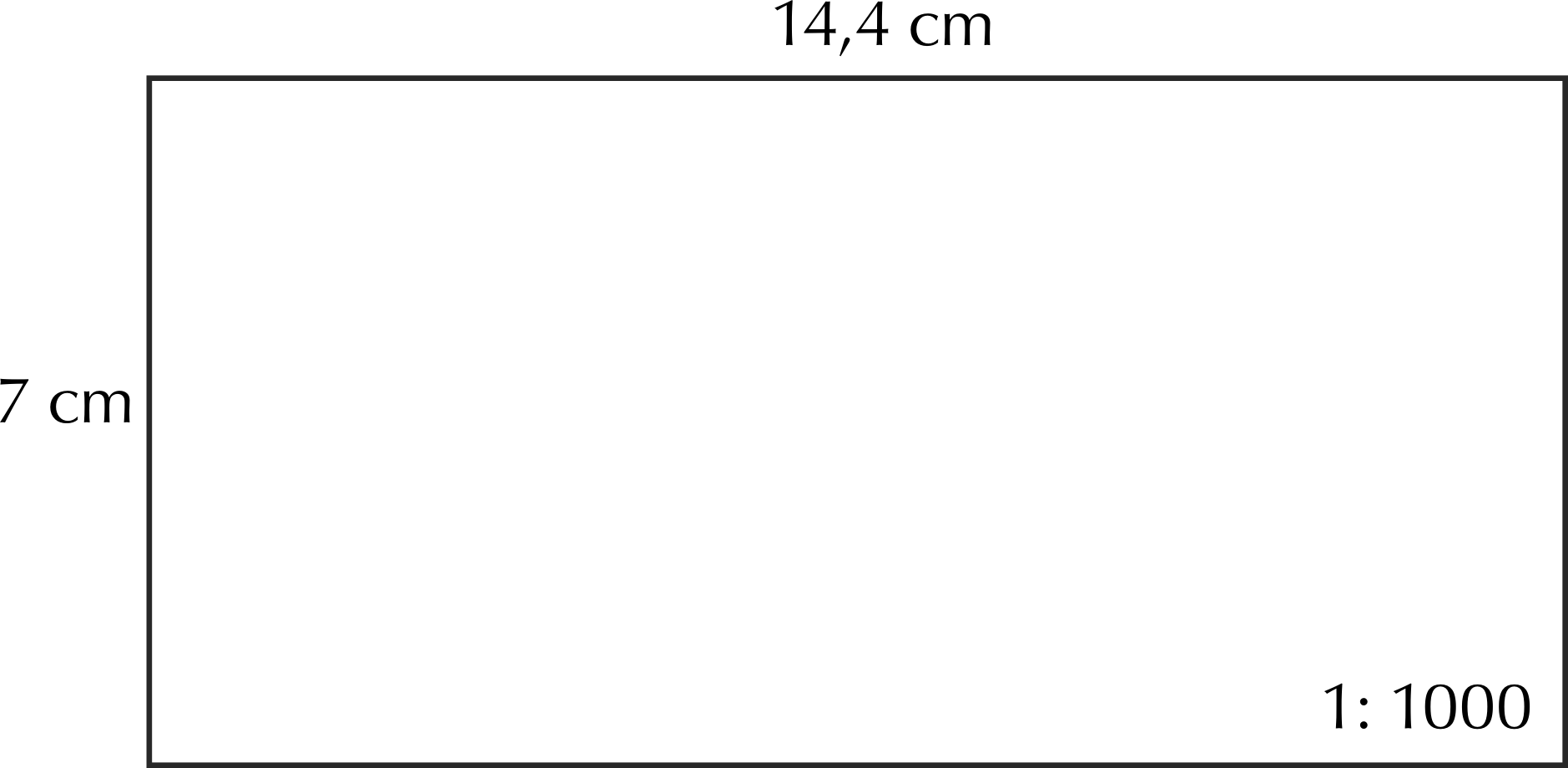 Width = \(\text{70}\) \(\text{m}\) = \(\text{7 000}\) \(\text{cm}\). \(\text{7 000}\) \(\text{cm}\) \(\div\) \(\text{1 000}\) = \(\text{7}\) \(\text{cm}\). So scaled width is \(\text{7}\) \(\text{cm}\). Length is \(\text{144}\) \(\text{m}\) = \(\text{1 440}\) \(\text{cm}\). \(\text{1 440}\) \(\text{cm}\) \(\div\) \(\text{1 000}\) = \(\text{14,4}\) \(\text{cm}\). So scaled length is \(\text{14,4}\) \(\text{cm}\).