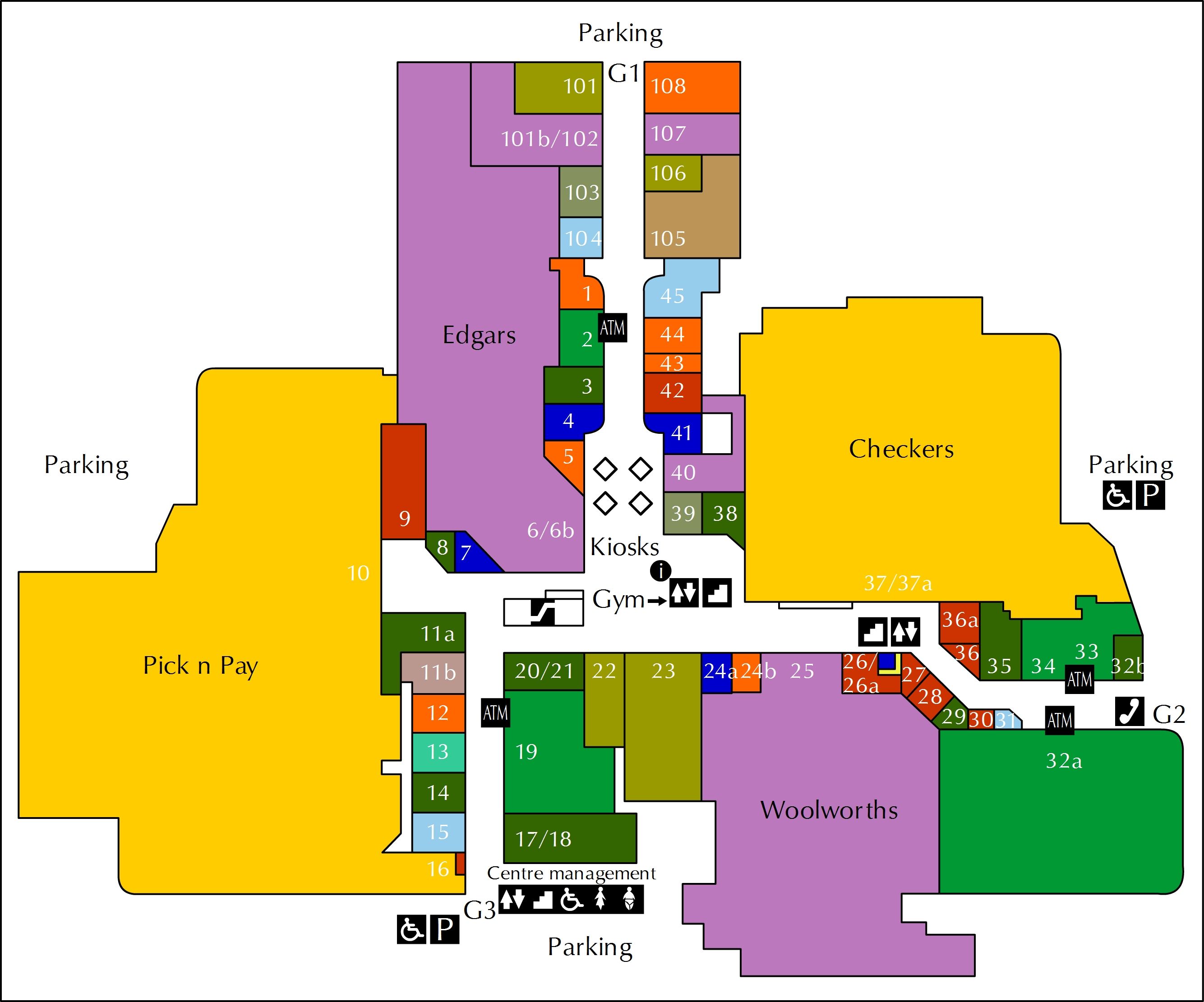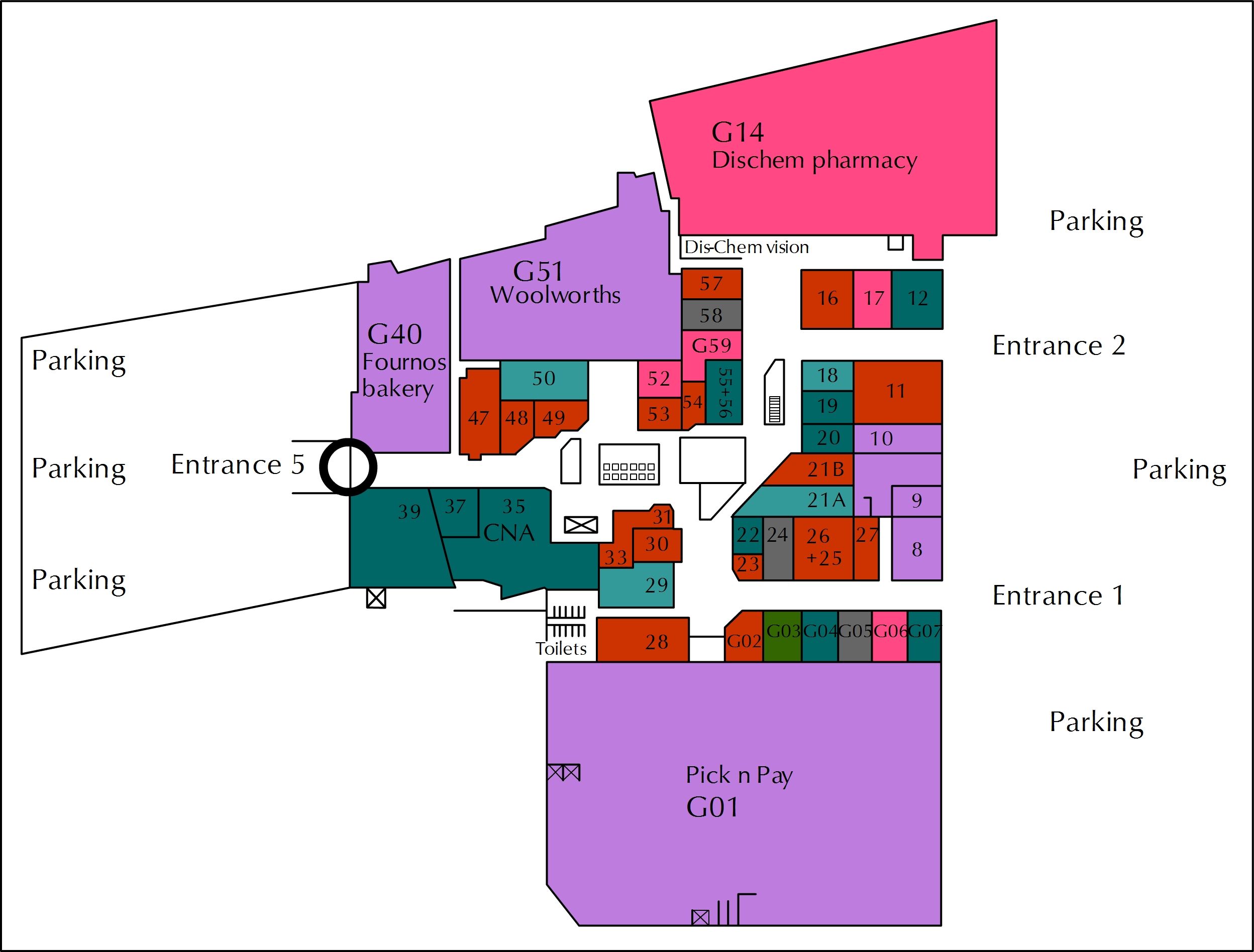 1. CNA: Go straight towards Shop 29. Turn right, go left around the corner at Shop 31. Go straight. CNA will be on your left. 2: Pick n Pay: Go straight passing shops G07 - G02 on your left. Turn left into the entrance of Pick n Pay.
