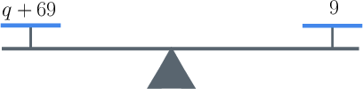This scale is in balance, so the right-hand side is equal to the left-hand side. So, something = something else. The equation should look like this: \(q + 69 = 9\).