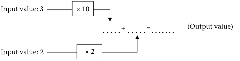We can think about this process as a flow diagram of input values. For example, to calculate the numerical value of \(10x + 2y\) for \(x = 3\) and \(y = 2\), we can complete the empty spaces in the diagram.