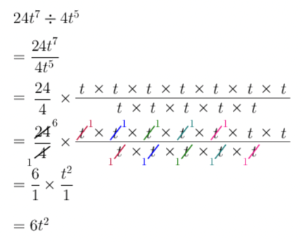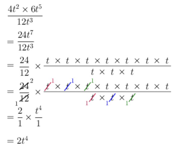 \[\begin{align} & 4t^{2} \times 6t^{5} \\ = &\ 4 \times 6 \times t^{2} \times t^{5} \\ = &\ 24 \times t^{2 + 5} \\ = &\ 24t^{7} \end{align}\]The denominator doesn’t need to be simplified: \(12t^{3}\).
