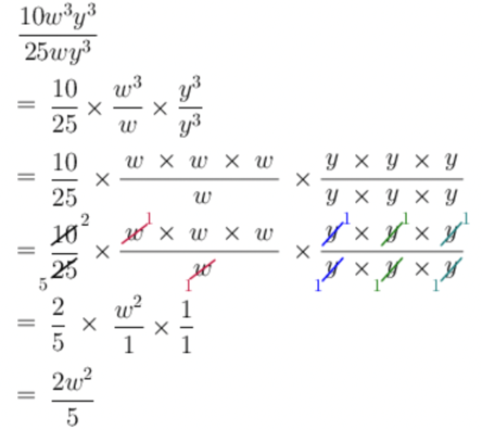 \[\frac{10w^{3}y^{3}}{25wy^{3}}\]Then evaluate the expression for \(w = 3\) and \(y = 9\).