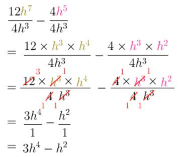 \[\begin{align} \frac{4h^{5}}{4h^{3}} &= \frac{4}{4} \times \frac{h^{5}}{h^{3}} \\ &= 1h^{5 - 3} \\ &= h^{2} \end{align}\]Subtract the answers.