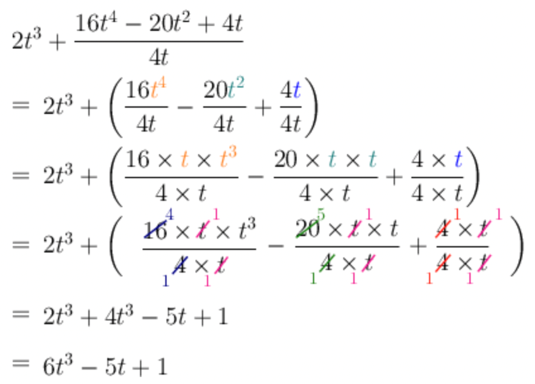 \[\begin{align} & 2t^{3} + \frac{16t^{4} - 20t^{2} + 4t}{4t} \\ = &\ 2t^{3} + \left( \frac{16t^{4}}{4t} - \frac{20t^{2}}{4t} + \frac{4t}{4t} \right) \end{align}\]Simplify.