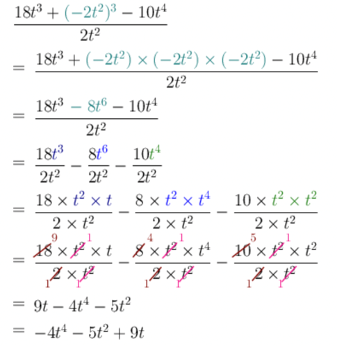 \[\frac{18t^{3} + \left( - 2t^{2} \right)^{3} - 10t^{4}}{2t^{2}}\]Simplify the term in the numerator within the brackets.