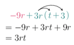\(- 9r + 3r(t + 3)\) has two terms: \(- 9r\) and \(+ 3r(t + 3)\). We must simplify the second term using the distributive law, before collecting like terms.