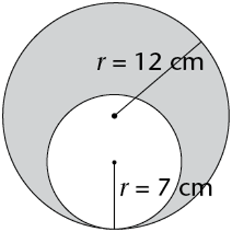 \[\begin{align} \text{Area of the shaded region } &= \text{(area of larger circle)} − \text{(area of smaller circle)} \\ &= \text{452,16} \text{ cm}^2− \text{153,86} \text{ cm}^2 \\ &= \text{298,3} \text{ cm}^2 \end{align}\]Write the final answer.