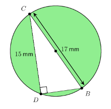 The diagram shows a circle and a right-angled triangle drawn within the circle. \(BC\) is a diameter of the circle. \(BC = 17 \text{ mm}\) and \(CD = 15 \text{ mm}\).
