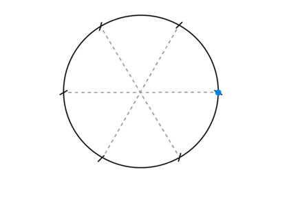 \(\frac{\ldots{^\circ}}{6} = \ldots^{\circ}\) - Use your protractor to confirm your answer to Question 8.