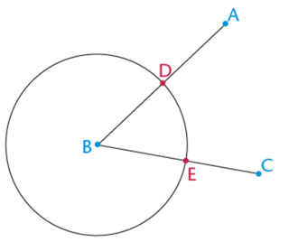 Place the compass on the vertex of the angle (point \(B\)). Draw an arc across each arm of the angle (shown as blue arcs in the diagram below).