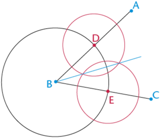 Place the compass on the point where one arc intersects an arm of the angle and draw an arc inside the angle. Without changing the compass width, repeat for the other arm of the angle so that the two arcs intersect (shown as red arcs in the diagram below).